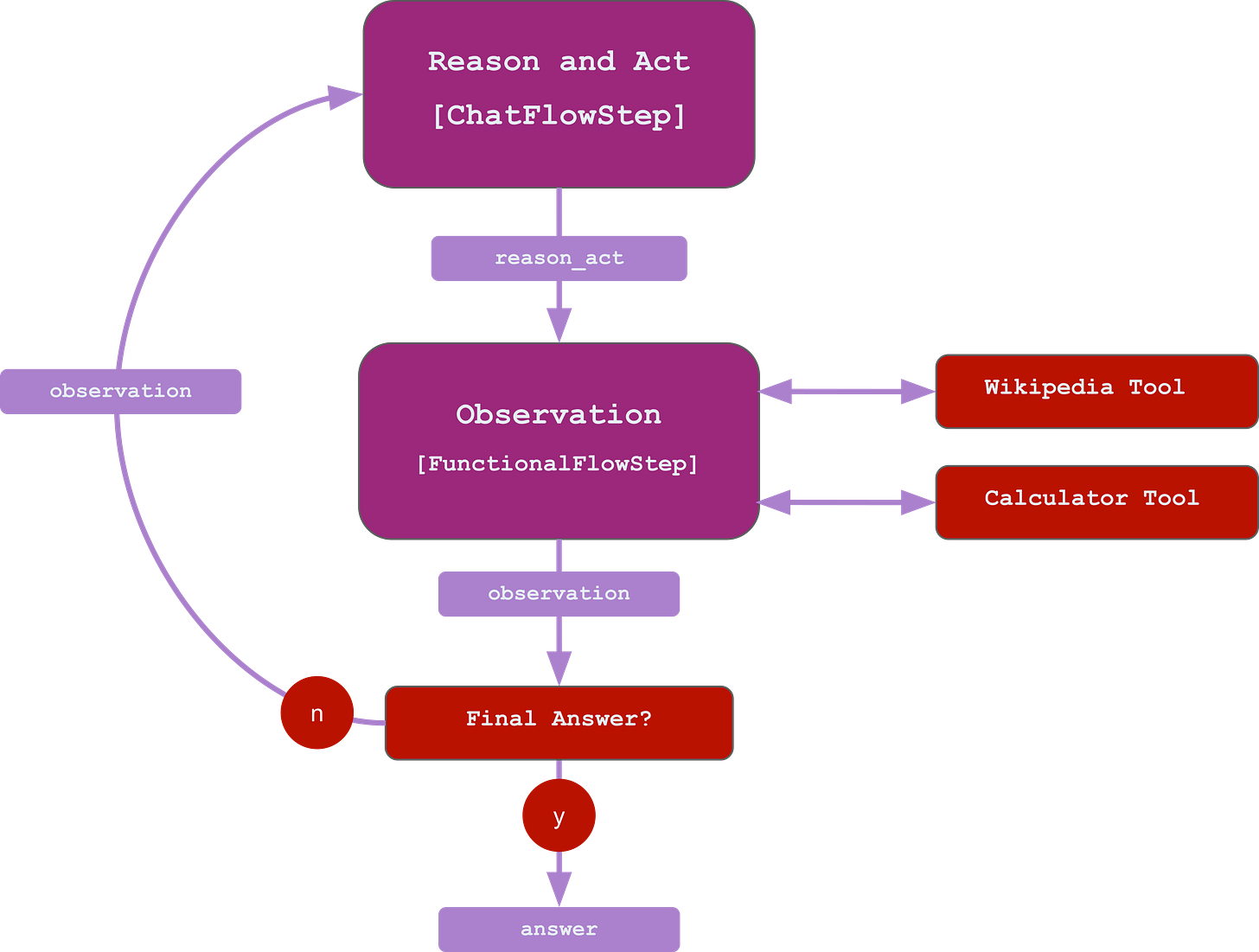 In LLM Flows, an agent can be represented as a flow that runs in a loop. We can implement the ReAct architecture by defining two flow steps: